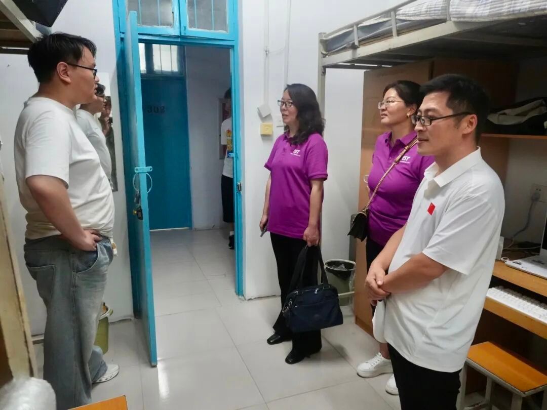在南苑学生公寓,副院长崔耀平特别关注学生宿舍的安全设施。他仔细查看了上铺围栏的高度和牢固度,测试了爬梯的稳定性,并叮嘱同学们在生活中要定期对宿舍设施进行自查,发现问题可以通过宿管或学院报修,学院将第一时间处理。