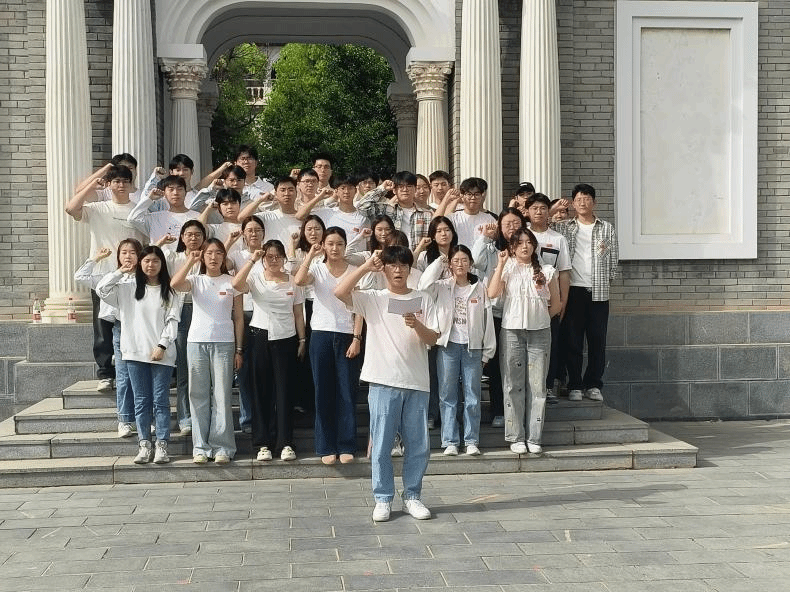 在明伦校区南门前,党员们齐唱河南大学校歌,悠扬旋律中饱含着对学校的深情与敬意;雄浑激昂的《没有共产党就没有新中国》,唱出对党的无限忠诚与热爱;铿锵有力的《团结就是力量》,传递出团结一心、奋勇向前的坚定信念。歌声回荡,镜头定格,一幕幕画面成为青春与信仰交织的永恒记忆。