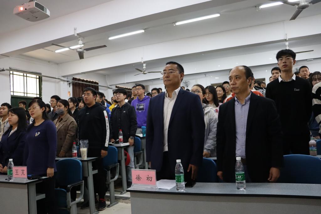 开班仪式伊始,全体起立,齐唱国歌。随后徐初书记上台发言,他向参加青马班的同学们提出了四点要求:“深化理论学习、加强实践锻炼、紧密联系同学、加强作风建设。”他同时强调在青马班学习是一个加强学生干部荣誉感、责任感和使命感的好机会,希望大家在青马班中努力提升自己,为学校的建设发展作出更大的贡献。接着,国际教育学院团委副书记刘燚昊带领所有学员宣誓。在铿锵有力的誓言中,全体学员感受到自己肩上的责任,并且表示在今后的学习生活中会更加努力,成为一名合格的青年马克思主义接班人。