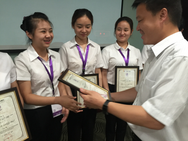 结业仪式由光大银行郑州分行政七街支行谷秋霞行长主持,整个结业仪式通过VCR短片、ppt串讲、才艺展示、情景剧等形式将同学们实习实训情况向到场的老师和家长进行汇报。家长代表朱红的发言热情洋溢,用“惊喜”和“欣慰”表达对同学们实习实训效果的认可和看到孩子成长的高兴心情。光大银行郑州分行张幸鸽副行长对“阳光菁英会”实习基地项目给予高度评价。她指出:通过校企合作共同搭建实习实训平台,为更多有出国意愿的同学提供高品质的实习实践经历,并为更多同学在这样平台上展示出的良好素质感到高兴。李从国副书记对同学们的表现给予了充分肯定,为实习基地导师对大家的表现说出“河南大学国际教育学院的学生真棒”的评语感到骄傲,感谢参加实训的同学们通过优异表现为学校和学院增光添彩。他认为课堂学习和社会实践同等重要。希望同学们加强学习,提升素质,坚定的走好职业发展的每一步。他也对光大银行的支持和家长的付出表示由衷的感谢。最后由张幸鸽副行长和李从国副书记共同为优秀实习生颁发优秀实习生证书,并与大家合影留念。