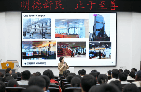 随后,维多利亚大学Bella老师作了主题发言。她向大家详细介绍了墨尔本作为“全球最宜居城市”之一的独特魅力,包括复古与现代并存的城市景观、丰富的自然旅游资源和多样化的国际美食。还重点向同学们介绍了维多利亚大学的校园环境、奖学金政策、实习就业和校企合作等学生支持体系。