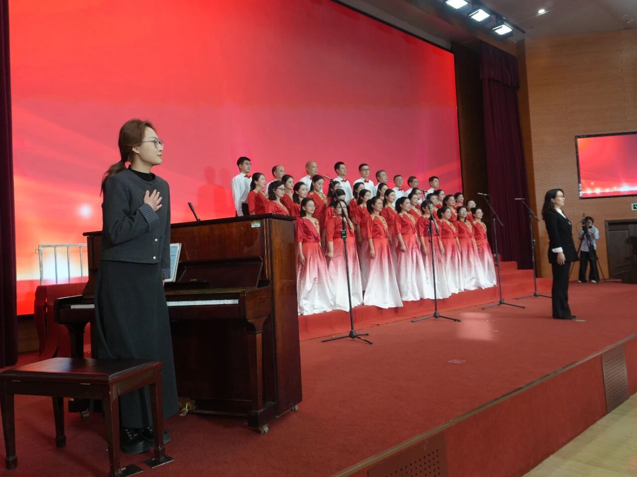 比赛现场,国际理工学院合唱团阵容整齐、精神抖擞。学院党委书记赵炎亲自担任指挥,她激情四射的动作与老师们浑厚有力的歌声交相辉映。
