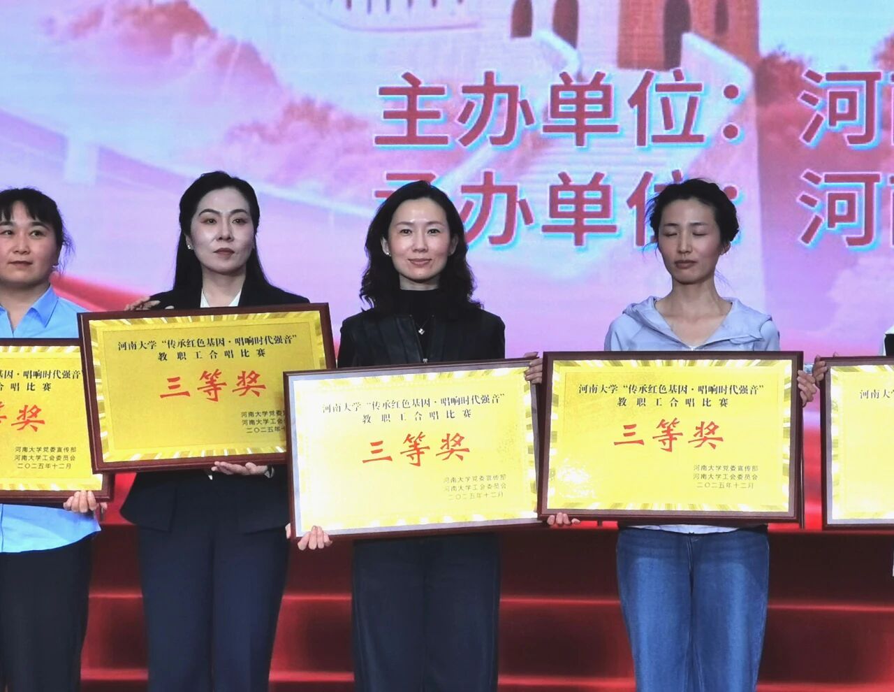12月6日晚,河南大学“传承红色基因 唱响时代强音”纪念抗战胜利80周年教职工合唱比赛圆满落幕。国际理工学院教职工合唱团以一曲深情激昂的《南泥湾》精彩亮相,凭借精湛的演绎和饱满的精神风貌,在全校46支参赛队伍中喜获三等奖。