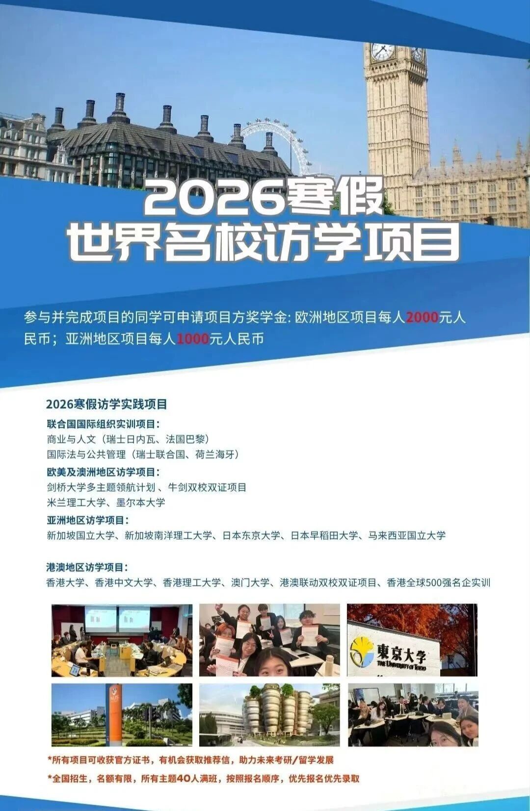 为进一步拓展学生国际视野,提高学生的创新意识、学术及科研能力,根据学校有关通知要求,拟组织学生参加2026寒假研修访学项目,现就相关事项通知如下: