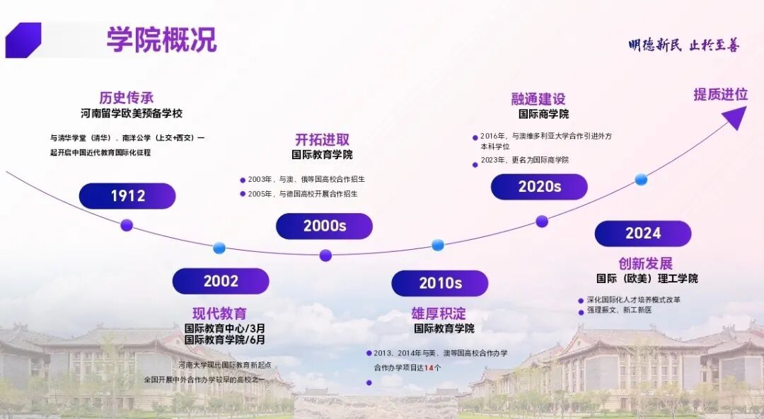 致各位亲爱的校友、尊敬的社会各界朋友: 河南高等教育的对外合作交流始于1912年成立的河南留学欧美预备学校,河南大学现代中外合作办学事业始于2002年成立的国际教育学院(学院前身)。随着国际化人才培养模式不断深化,学校优化组建河南大学国际(欧美)理工学院