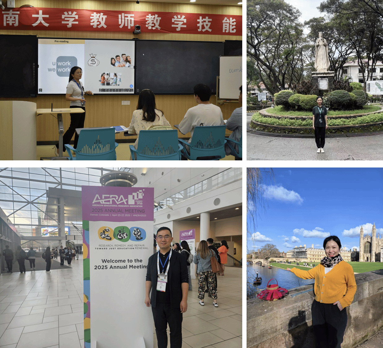 师资是教学创新的核心引擎。学院坚持内培外引、教研相长、国际协同,打造高水平英语教学团队。近五年,团队承担省部级、市校级教改科研项目 10 余项,发表学术论文 20 余篇;多名教师赴境外高校攻读博士、赴剑桥大学访学,每年选派骨干教师赴澳大利亚维多利亚大学参加教学工作坊,常态化参与国际学术交流并作主题报告,在国际舞台展现学院教学改革成果。