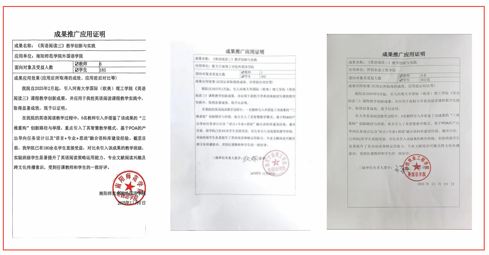 进入新时代,学院英语课程迈入思政引领、专业融合、实践赋能、数智升级的高质量发展新阶段。课程将家国情怀、科学精神、跨文化素养融入教学全过程,开设学术英语、国际交流口语、英语创新实践等特色模块,打造英语演讲、模拟国际学术会议等实践平台,推动 “英语 + 理工” 双向赋能。同时,引入智能教学平台与 AI 测评系统,推进数字化、个性化教学,着力提升学生全球胜任力与跨文化沟通能力。其中,《英语阅读三》课程教学创新成果被多所兄弟院校引进应用,落地实施效果良好,获得广泛认可。