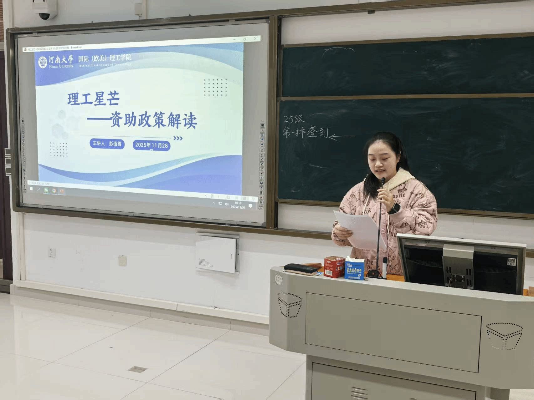 资助育人,筑梦理工;榜样领航,聚力远航。为落实国家资助政策,打通奖助信息传递的“最后一公里”,同时发挥优秀学子的示范作用,助力理工学子明确成长方向,11月28日,国际理工学院于郑州校区友兰南楼B座306成功举办“理工星芒,奖助护航”资助励志分享会(郑州校区场)。国际理工学院2025级辅导员杨震老师出席活动,2022级至2024级中澳计算机科学与技术专业的优秀学子分享经验,为在场同学送上“政策干货+成长秘籍”双重盛宴。