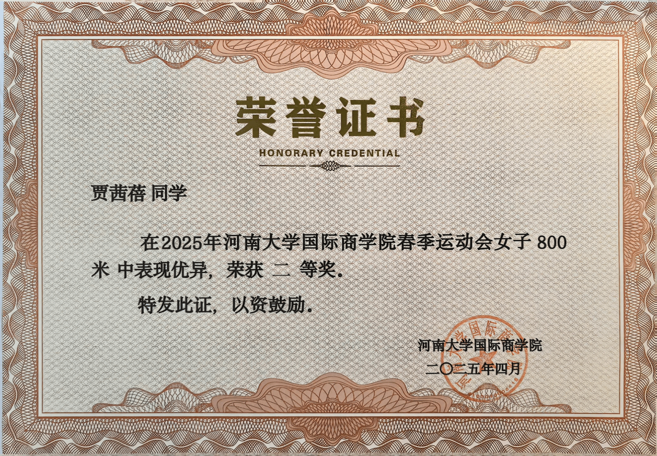 贾茜蓓,共青团员,河南大学国际理工学院2024级中澳计算机科学与技术专业13班学生,年级学习委员。2024-2025学年学业成绩与综合成绩均位列专业第一,获2024-2025学年国家奖学金。