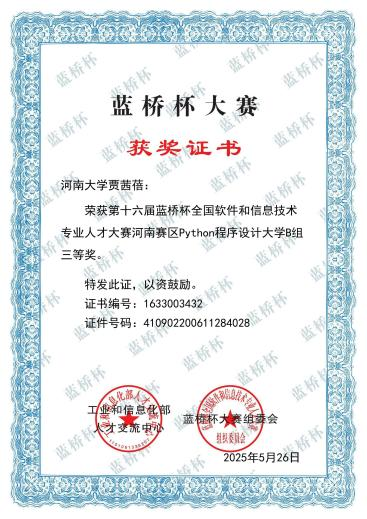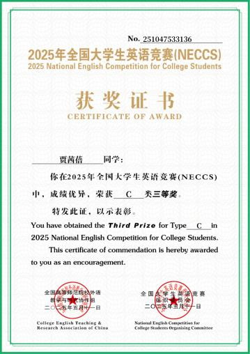 在全国大学生英语竞赛和蓝桥杯全国软件和信息技术专业人才大赛中获得的省级奖项,对贾茜蓓而言更像是一面镜子。透过竞赛这面镜子,她既看到了自己阶段性的学习成果,也清晰地照见了继续提升的方向。这种将竞赛视为自我检验与路径校准的视角,让她能以一份平和的心态,在学习道路上走得更加稳健从容。