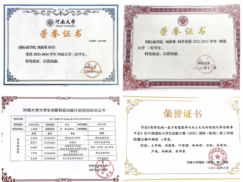 “测控技术讲究精准严谨,学习亦是如此。”这是刘满果三年来的学习信条。作为国际理工学院的学子,她深耕测控技术与仪器专业,系统掌握核心理论与实践技能。凭借扎实的学习功底与不懈的钻研精神,学业成绩和综测成绩均排名年级前15%,连续两年获得“河南大学三好学生”荣誉称号。同时,她躬身实践,在夯实理论基础的同时,坚持“学用结合、以赛促学”,主动将专业知识转化为实践能力,积极参加各项学术竞赛和校园活动,参与一项大学生创新创业训练计划项目已结项,以四作参与一项实用新型专利“一种电气自动化的充电桩设备”项目已受理,并荣获“第九届河南省大学生机器人竞赛河南大学校赛三等奖”“中国国际大学生创新大赛河南大学国际(欧美)理工学院二等奖”等多项奖项。