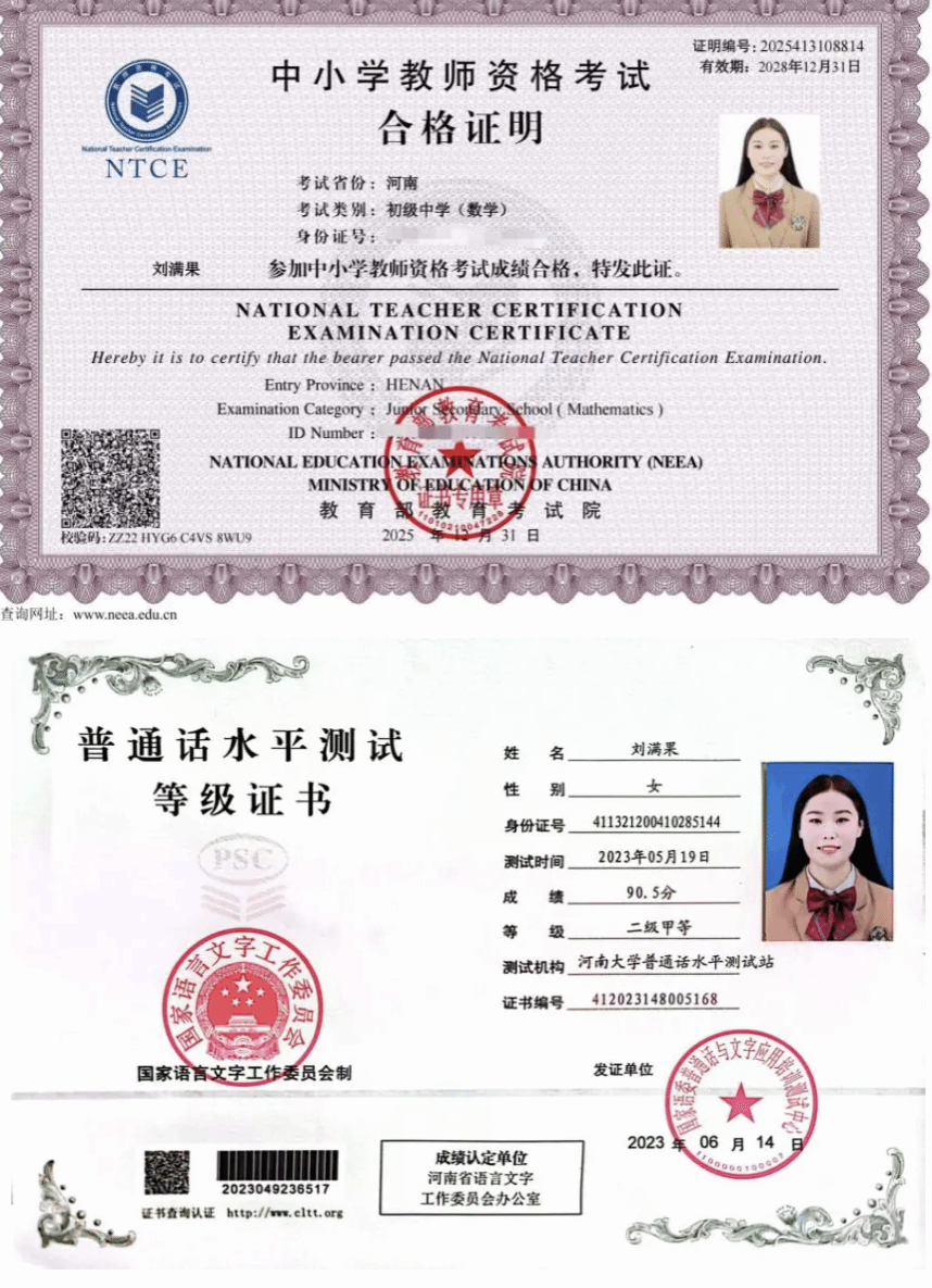 刘满果也多次参加社会实践活动,以实际行动传递温暖,用点滴善举诠释青年担当。她连续三年投身暑期“三下乡”社会实践活动,始终以脚步丈量祖国大地的广度,以行动传递青年精神的温度,在基层一线的实践课堂中淬炼成长、践行担当。2023年在“童心港湾 筑梦暖阳”爱心支教团担当知识的传递者与梦想的守护者,2024年在“‘河’力助农 ‘乡’约青春”基层服务践行团担当资助政策的传播者与走访田间地头的调研者,2025年在“‘豫’见青霞 ‘河’你相约”红色文化实践团担当红色基因的传承者与社区服务的实践者。此外,她也注重在生活中全面发展,目前已取得中小学教师资格考试合格证明以及普通话水平测试二级甲等证书。