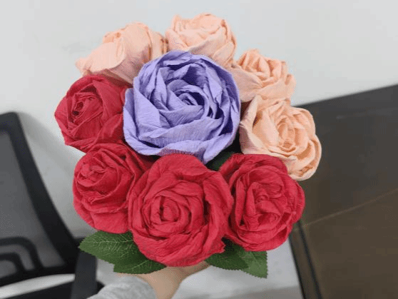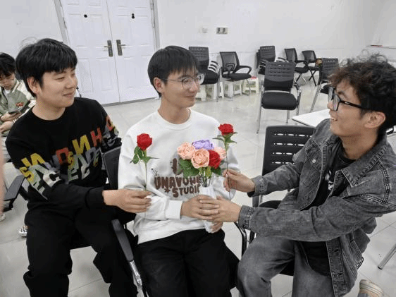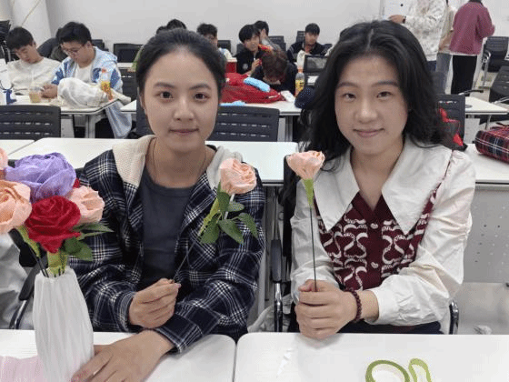 随后,“赠人玫瑰,手有余香”——手工花束制作与赠送活动温馨开展。支部成员们提前准备了彩色皱纹纸、剪刀、胶带、丝带等手工材料,细致地裁剪、捻转、粘贴,将平凡的皱纹纸变为一朵朵栩栩如生、色彩缤纷的褶皱花。同学们将这些饱含深情的手工花束,连同写满心里话的卡片,亲手送给日夜耕耘在教学一线的老师们、保障一日三餐的食堂工作人员、守护宿舍安宁的宿管阿姨们。团员们深刻体会到,“助人为乐”的“乐”,不仅在于结果,更在于主动看见、真心感谢、传递善意的过程本身;“服务人民”也并非遥不可及,它始于对身边每一位平凡奉献者的尊重与关怀。