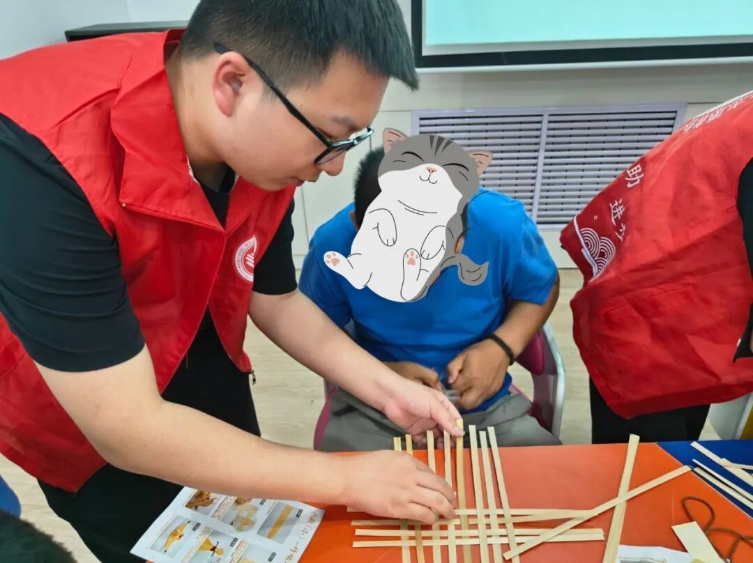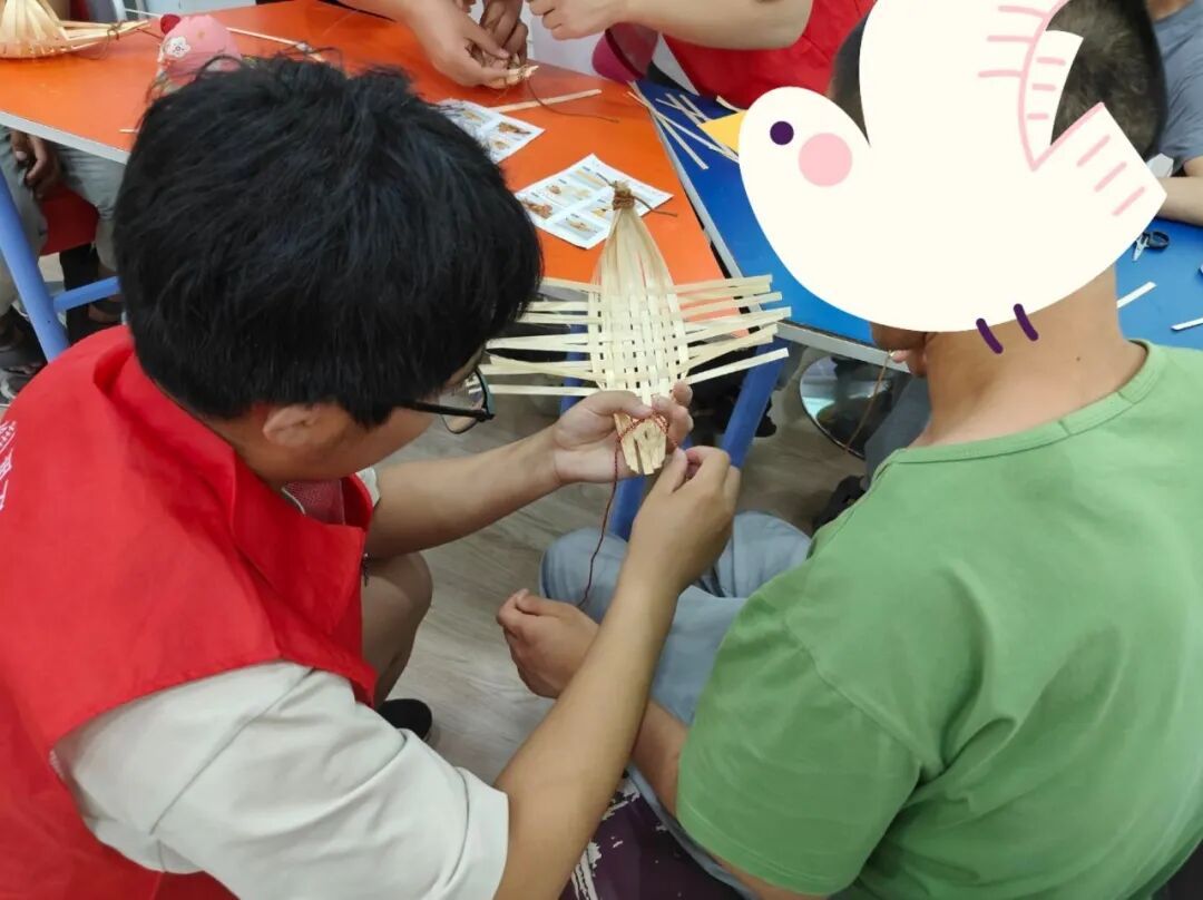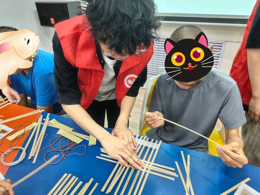 活动首个环节 "龙舟寄情・纸笺传愿" 现场,志愿者耐心向养员们讲解龙舟文化中 "同舟共济" 的精神内涵,并分发竹条与彩纸,带领大家编织迷你龙舟框架。制作过程中志愿者与养员们协作,志愿者将竹条弯曲,养员小心地用绳子将竹条固定。当三十余艘承载着不同期望的龙舟在展示区一字排开时,志愿者感慨道:"每个龙舟都是独一无二的,就像每个人对生活的向往,值得被认真对待。"