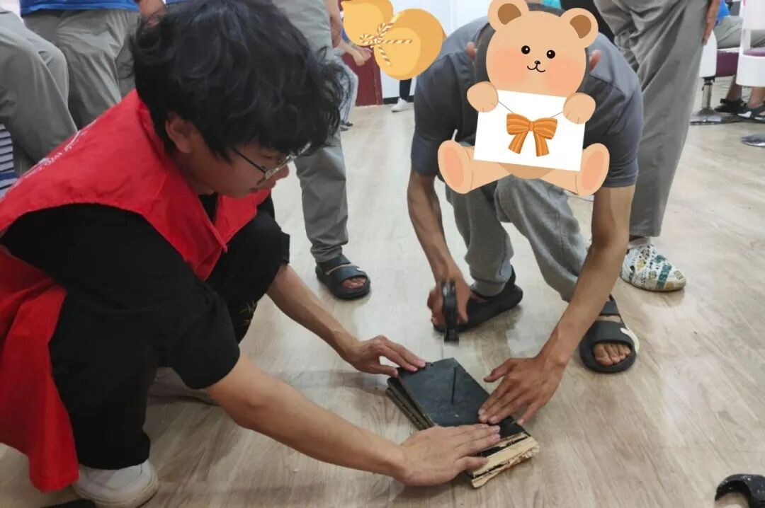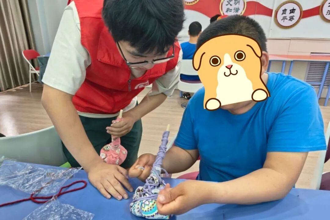 在 "艾草凝香・感恩同行" 环节,志愿者与养员围坐在一起,将晒干的艾草填入白色的布囊,插入木条作为锤柄,再裹上一层彩色的布块,最后在锤艾草锤的锤柄上缠绕一圈彩绳。志愿者们耐心地向养员传授艾草锤的制作方法并及时地帮助他们解决制作过程中出现的难题。活动结束,养员们将亲手制作的艾草锤郑重地递给福利院社工,这场双向的温暖传递,让助残日的关怀不仅停留在受助者身上,更延伸到了默默付出的守护者群体。