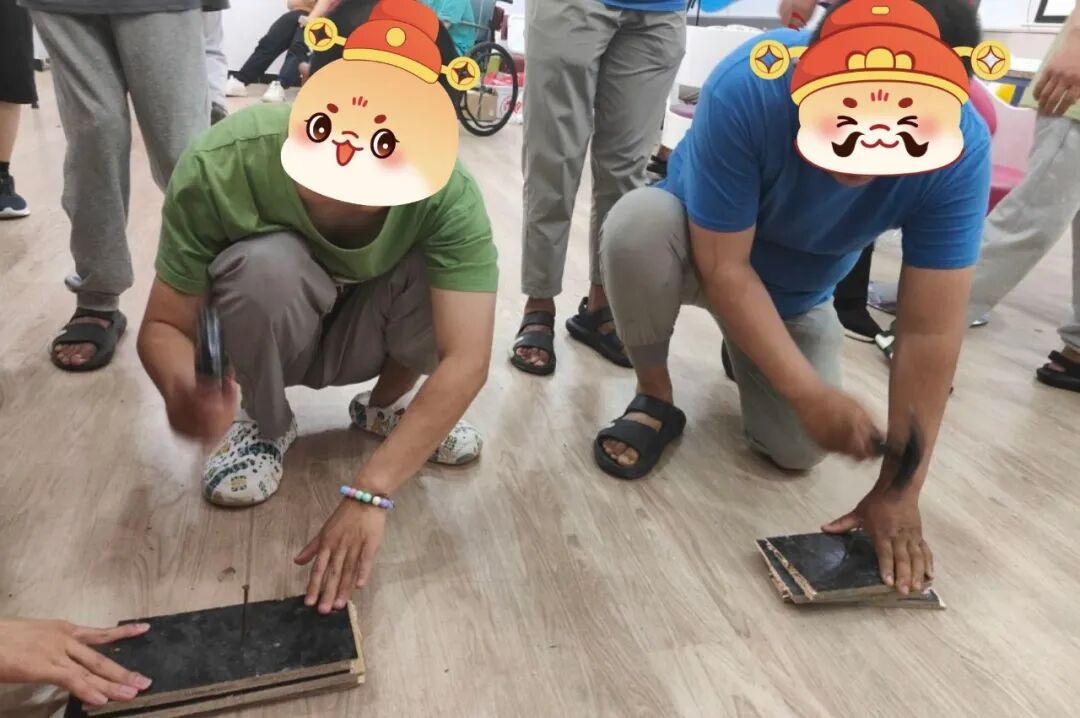 最令人动容的当属 "匠心筑梦・共赴新程" 团队挑战赛。志愿者将木板堆叠在一起,养员们两人一组,轮流用锤子在木板上钉钉子。过程中穿插着助残知识问答,每次正确地回答都能让团队获得一次落锤的机会,让养员们在游戏的同时也收获了知识。养员在完成最后一枚钉子后兴奋地与队友击掌:"原来我们一起努力这么厉害!" 负责做裁判的志愿者发现,原本有些内向的养员们在比赛中逐渐打开心扉,互相提醒,默契配合。"他们在团队中展现出的凝聚力和创造力,让我们看到了助残工作的深层意义 —— 不仅是物质帮助,更是通过平等参与激发精神上的自立与自信。"