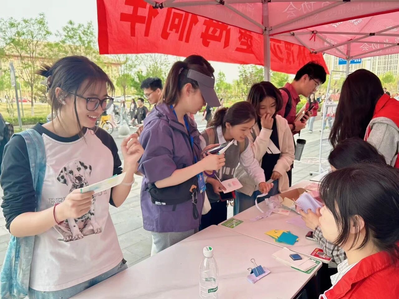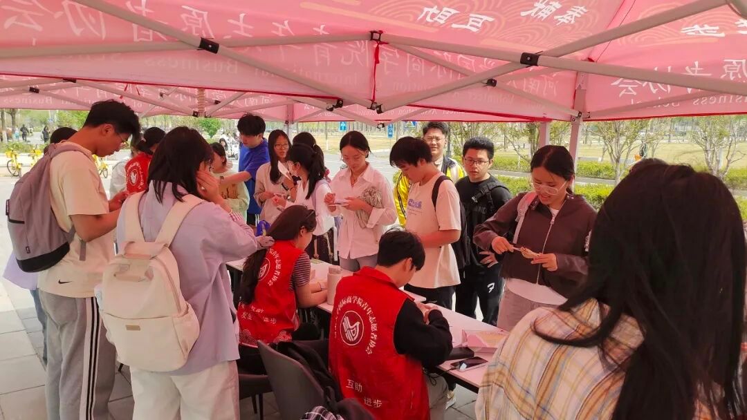 本次活动形式多样,富有趣味。“Emoji猜书名”吸引了众多师生参与,志愿者展示精心设计的Emoji卡片,细心引导活动开展。师生认真思索,踊跃猜测经典书名,小小的帐篷之下洋溢着浓厚的书香氛围。飞花令环节,古典音乐与墨香交织,师生围绕关键字吟诵诗句,尽显文学底蕴。福袋区域同样备受欢迎,师生抽取福袋,在志愿者协助下答出经典佳句的来源书目,欢声笑语不断,让参与者沉浸式感受文学魅力。