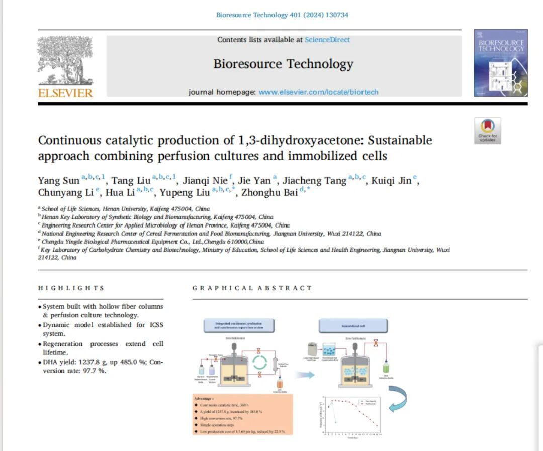(2)于《Bioresource Technology》发表一篇SCI一区论文《Continuous catalytic production of 1,3-dihydroxyacetone through sustainable system using perfusion culture and immobilized cells》